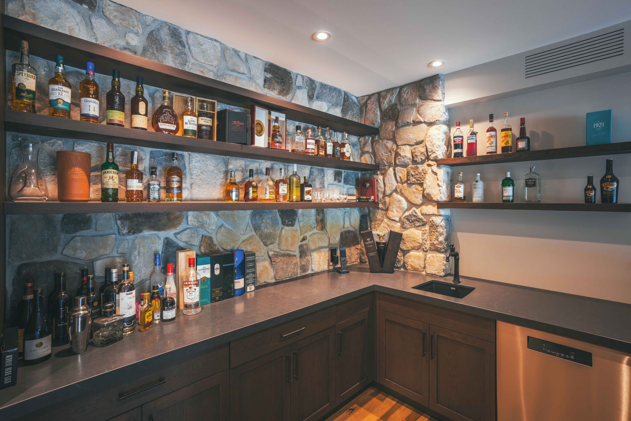 This stunning custom build is wrapped inside and out with our Echo Ridge® Dressed Fieldstone by Cultured Stone®, creating a warm, grounded aesthetic that flows seamlessly through every space. From the exterior façade to the interior fireplace, staircase feature wall, indoor bar, and even the outdoor kitchen, this home is basically a love letter to stonework done right.