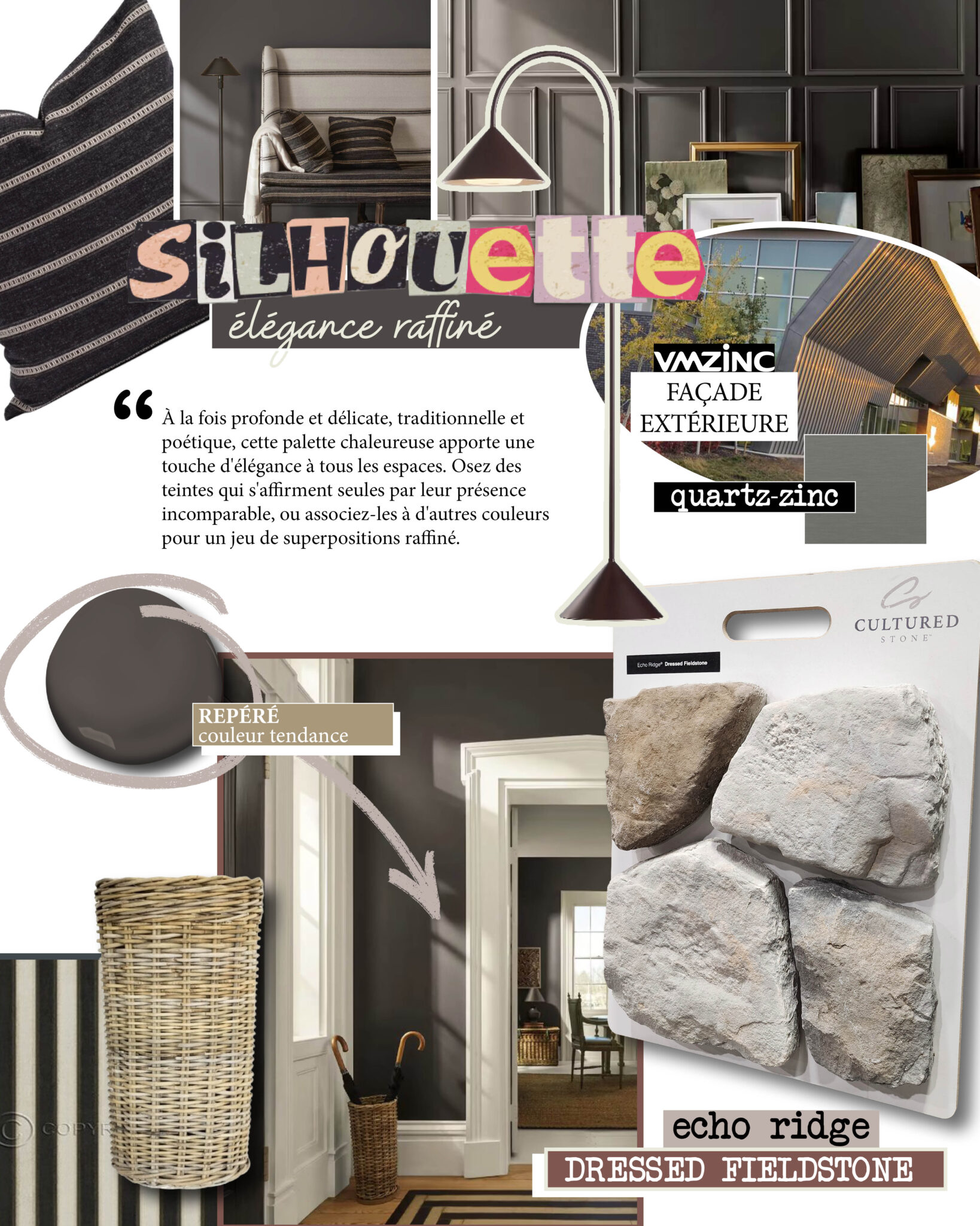 La teinte brun cendré de Silhouette crée une base à la fois feutrée et équilibrée, parfaitement mise en valeur par la texture raffinée d’Echo Ridge® Dressed Fieldstone. L’ajout de VMZINC apporte une touche épurée et contemporaine, intentionnelle et résolument architecturale. Alors que le design en 2026 s’oriente vers des palettes plus riches et un mélange de matériaux, cette combinaison offre du caractère sans compromettre la durabilité ni la sophistication.