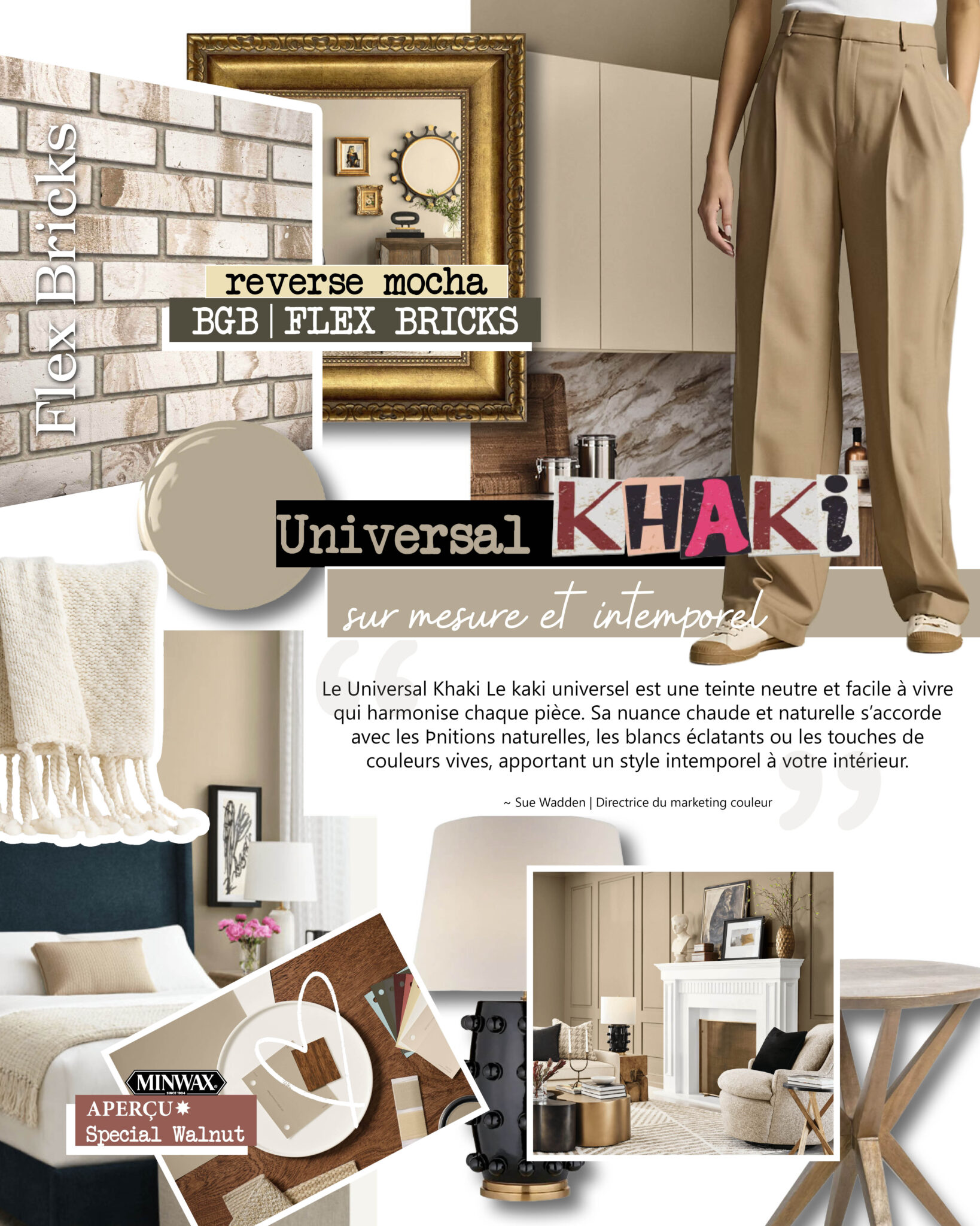 Universal Khaki est un brun pâle raffiné qui apporte de la chaleur sans dominer le design. Combiné à BGB Reverse Mocha, le contraste subtil et la texture ajoutent de l’intérêt visuel tout en gardant une palette accessible. Cet agencement reflète l’évolution des neutres en 2026 — moins plats, plus dimensionnels — ce qui en fait un choix judicieux autant pour les projets résidentiels que commerciaux à la recherche d’un style intemporel avec une touche moderne.